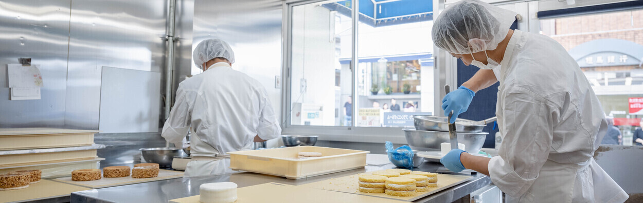 厨房は生菓子、シュークリーム、クッキー、原材料加工など8つの工房に分かれています。入社後は研修で、すべての工房を体験したあと、適性や希望を考慮して各部門に配属となります。